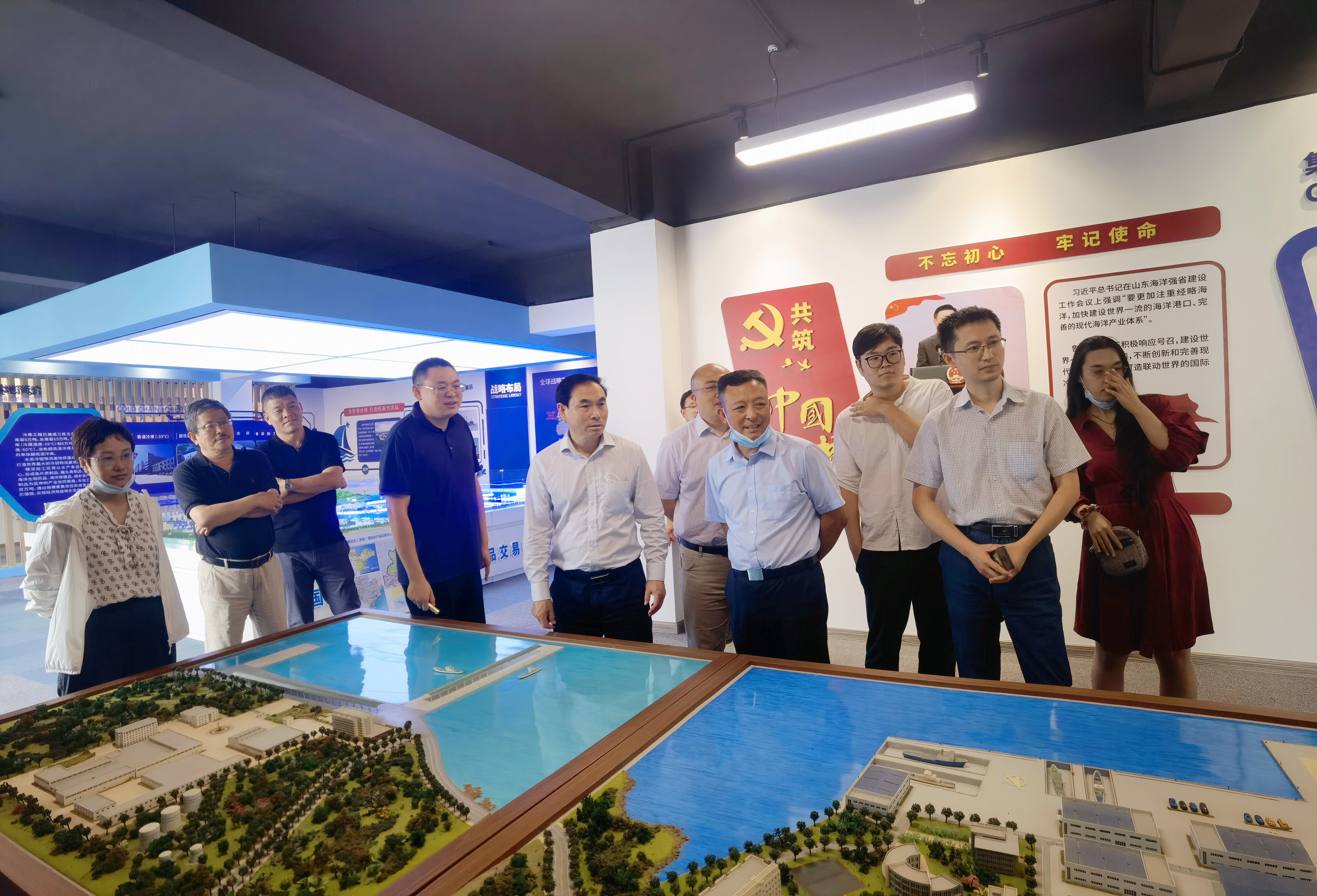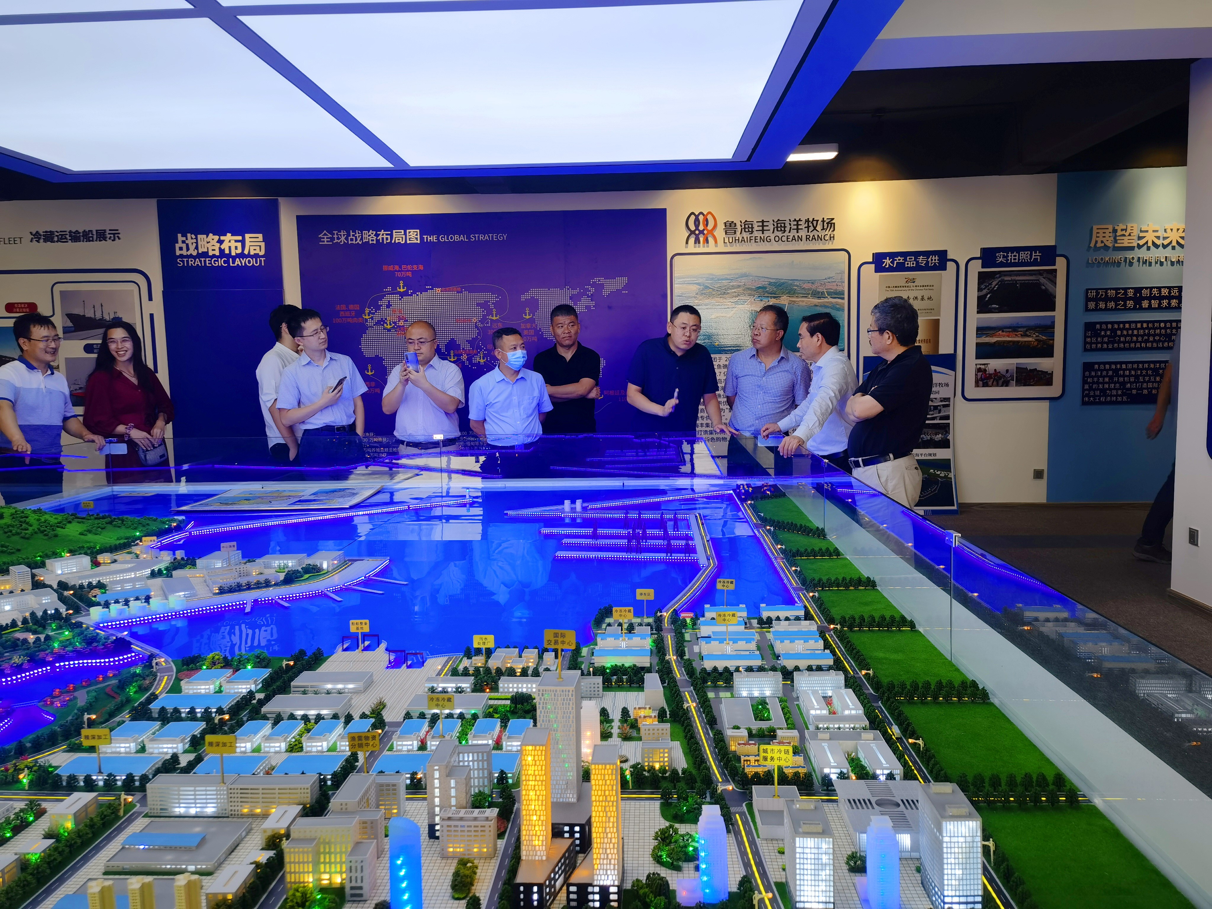 隨后,考察組(zu)來到魯海豐集團展廳。總(zong)經理劉(liu)潤澤通過沙盤模型與(yu)視頻資料介紹了中(zhong)國北方(青島(dao))國際水產品交(jiao)易中(zhong)心和冷鏈(lian)物流基(ji)地的(de)項目(mu)進展和未來規劃。基(ji)地位于(yu)董家口胡家山(shan)作(zuo)業區,規劃總(zong)面積(ji)12.26平方公里,總(zong)投資330億元(yuan),是(shi)青島(dao)市重點項目(mu)和海洋漁業一號工程。冷庫一期(qi)的(de)三棟現代化冷庫、二(er)期(qi)的(de)兩棟多層冷藏庫,均已建(jian)成,三期(qi)將于(yu)2023年(nian)12月完(wan)工。